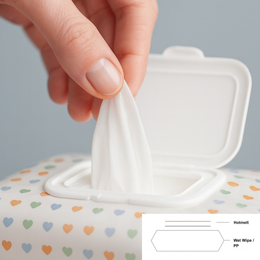 Islak mendil kapakları, ürünlerin nemini koruması ve hijyenini sağlaması açısından kritik bir uygulamadır. Yüksek performanslı yapıştırıcılar, kapak ile paket arasında güçlü bir bağ oluşturarak sızıntıyı önler ve mendillerin uzun süre nemli kalmasını sağlar.